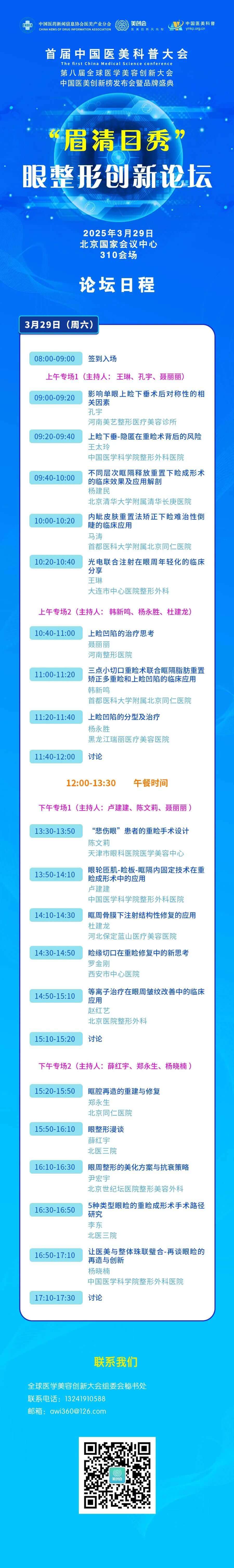 首届中国医美科普大会,第八届全球医学美容创新大会中国医美创新榜发布会暨品牌盛典将于2025年3月28-30日在北京国家会议中心举行,眉清目秀·眼整形创新论坛日程如下。