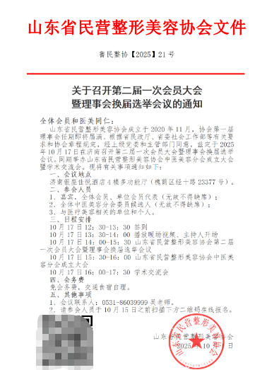 山东省民营整形美容协会成立于2020年11月,协会第一届理事会任期即将届满。根据省民政厅、省委社会工作部等有关要求和协会章程规定,经上级党委和主管部门同意,兹定于2025年10月17日在济南召开第二届一次会员大会暨理事会换届选举会议。同期举办山东省民营整形美容协会中医美容分会成立大会暨学术交流会。现将有关事项通知如下:一、会议地点