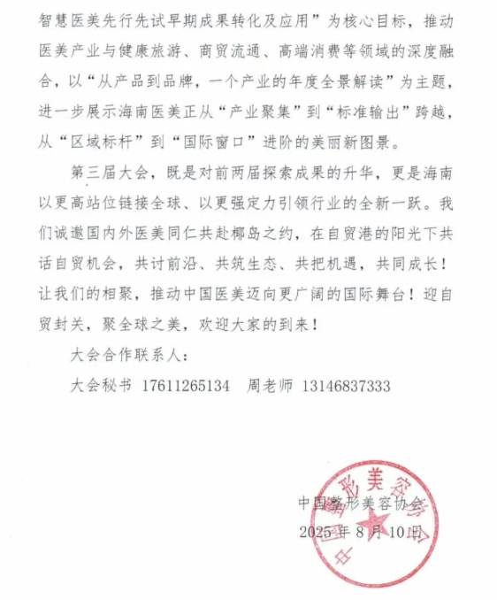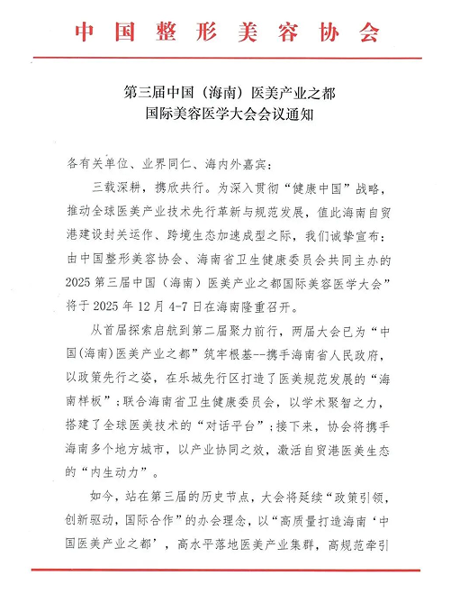 三载深耕,携欣共行。为深入贯彻“健康中国”战略,推动全球医美产业技术先行革新与规范发展,值此海南自贸港建设封关运作、跨境生态加速成型之际,我们诚挚宣布:由中国整形美容协会、海南省卫生健康委员会共同主办的2025第三届中国(海南)医美产业之都国际美容医学大会”将于2025年12月4-7日在海南隆重召开。