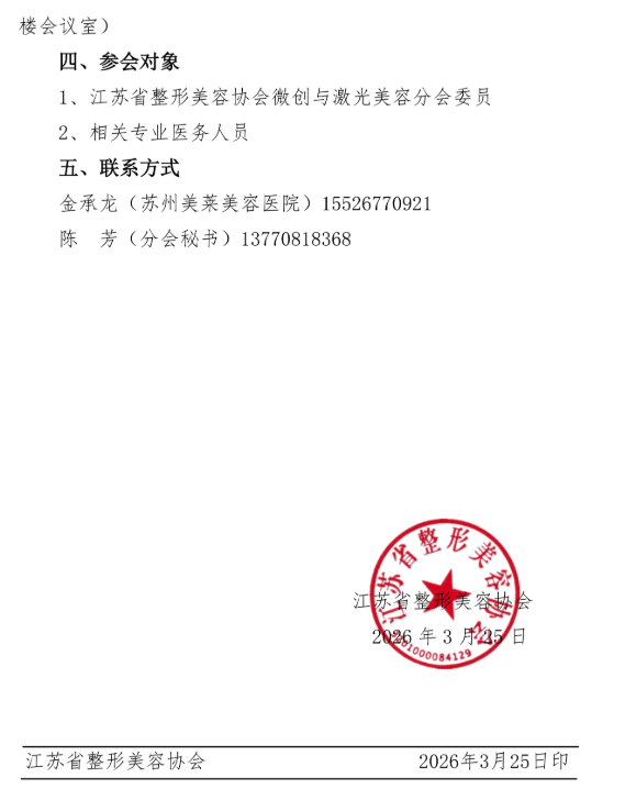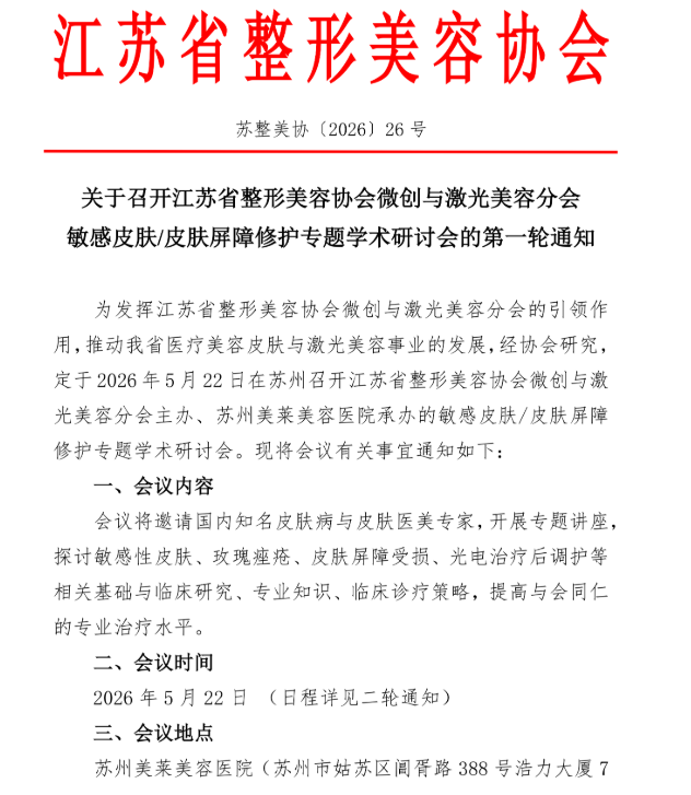 为发挥江苏省整形美容协会微创与激光美容分会的引领作用,推动我省医疗美容皮肤与激光美容事业的发展,经协会研究,定于2026年5月22日在苏州召开江苏省整形美容协会微创与激光美容分会主办、苏州美莱美容医院承办的敏感皮肤/皮肤屏障修护专题学术研讨会。现将会议有关事宜通知如下: